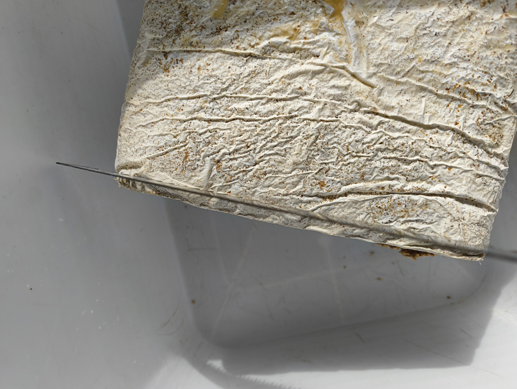 最初に、作業する容器の中で、ブロック表面を覆っている白い皮膜(パンの耳的なやつ)を薄くカットしていきます。